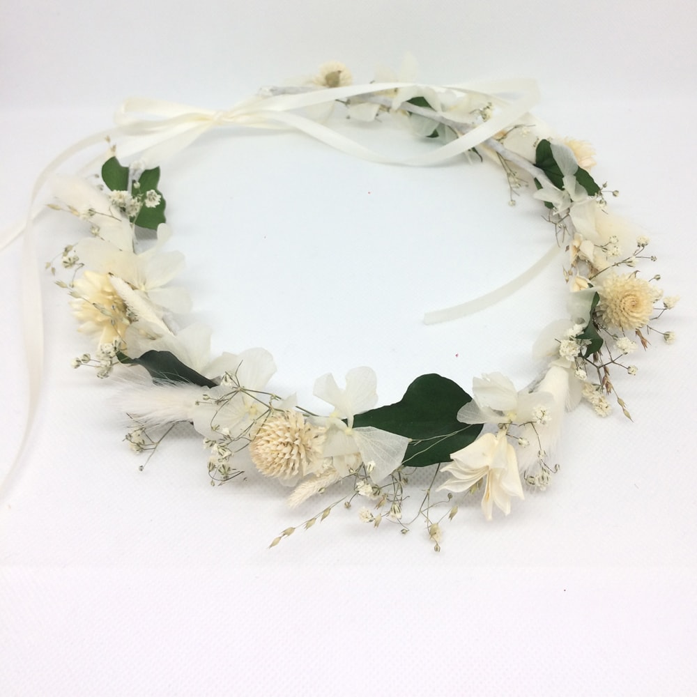 Couronne De Fleurs Sechees Et Stabilisees Ecru Et Vert