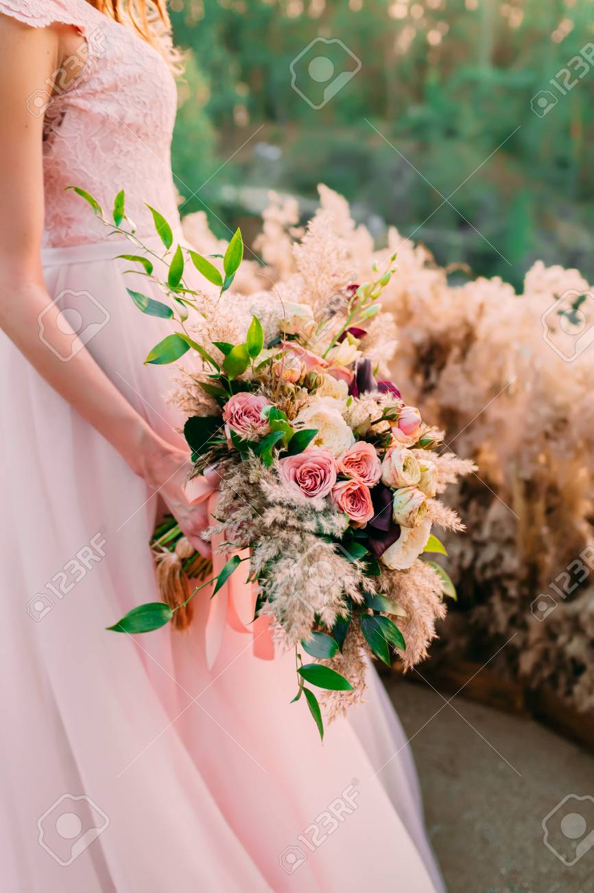 Une Mariee Detient Bouquet De Mariage Rustique Compose De Fleurs